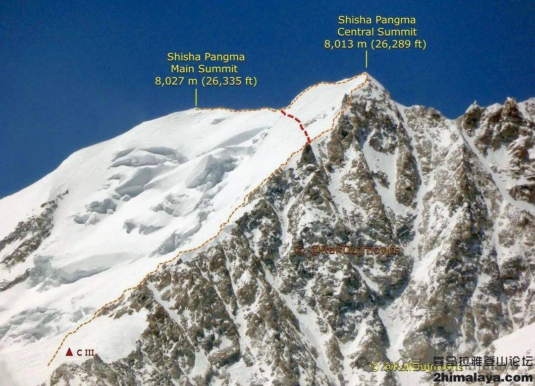 1985年,Oswald Gassler & Peter Wörgötter进行了希夏邦马峰的滑雪下撤。但这是否是山峰的首次滑雪返回?他们是否从真正的顶峰下撤?传言显示,二人是从中央峰开始滑雪,这座卫峰的海拔高度为8,008米。这里是商业探险团队客户通常止步的地点,自1987年起,山峰出现了数次从这里开始的滑雪返回。去往海拔8,021米的主峰,人们需要沿刀刃山脊继续行进一个小时,所以,考虑到达主峰的难度,很难确定是否有人从真正的顶峰滑雪返回。传统上,希夏邦马峰的滑雪下撤似乎是从中央峰开始。但1999年,传奇意大利极限滑雪者Edmond Joyeusaz成为首位,也是迄今为止唯一一位从真正的顶峰,希夏邦马峰海拔8,021米的高点滑雪下撤的探险者。